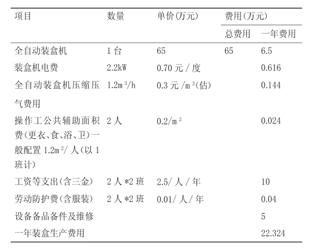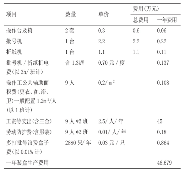 傳統(tǒng)手工裝小盒包裝的產(chǎn)量為60支/min(數(shù)據(jù)來(lái)源于某制藥廠軟膏車(chē)間),一般需4人/班完成(含折說(shuō)明書(shū)和批號(hào)打印),若以生產(chǎn)速度120支/min為例,另加1人輔助,則裝小盒工作需9人/班完成,以2(班/天)計(jì)算,則一年軟膏劑裝小盒的生產(chǎn)費(fèi)用,如下圖所示,其中設(shè)備以10年折舊,建筑以20年折舊,工作日250天/年,8h/班計(jì)算。